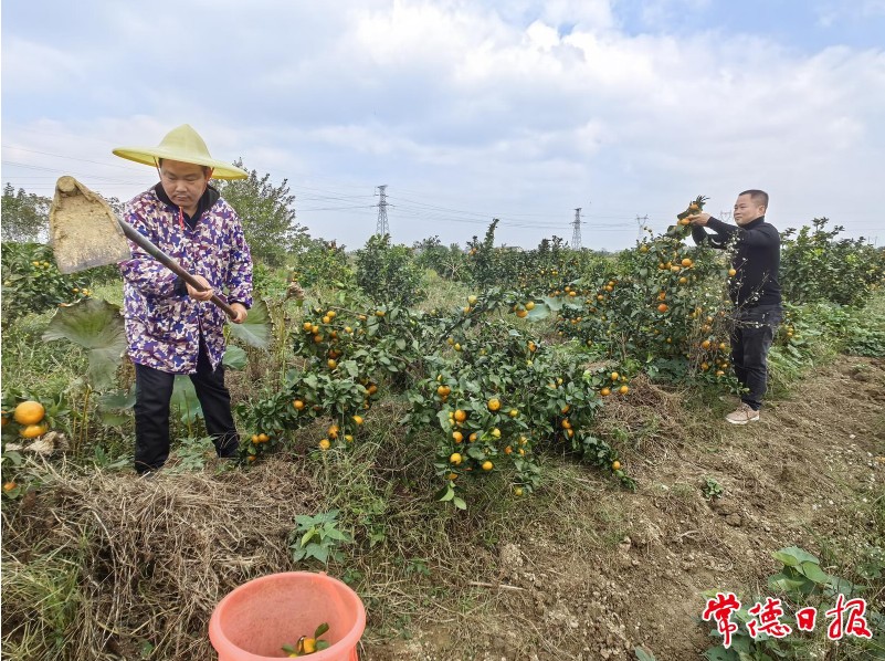 村民给橘林除草。